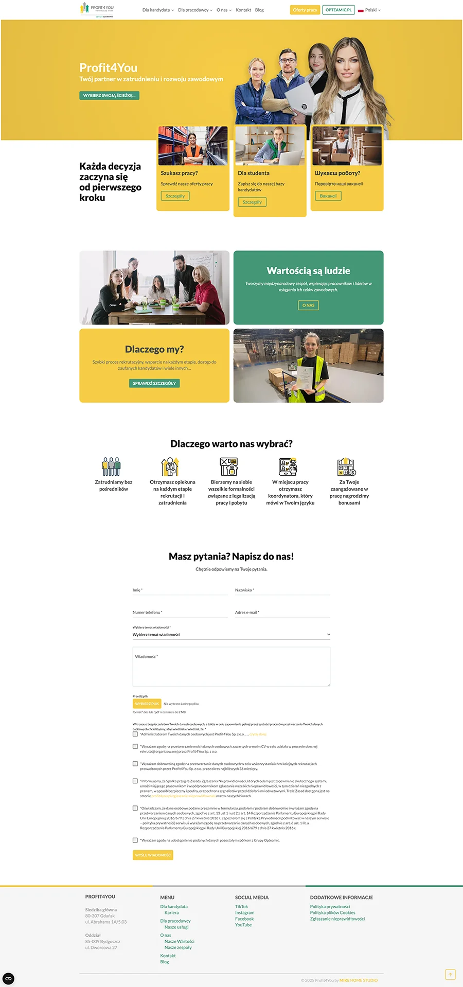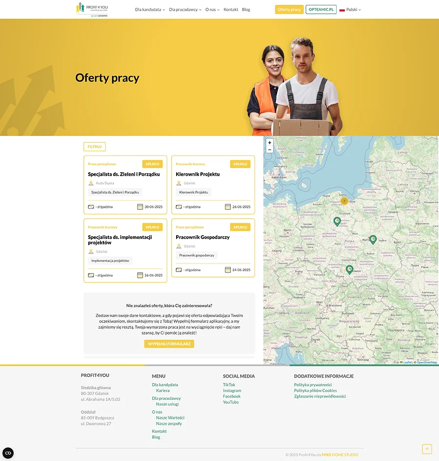 Strona internetowa Profit4You została zaprojektowana jako nowoczesne narzędzie wspierające rekrutację i legalne zatrudnianie cudzoziemców oraz Polaków na różnego rodzaju stanowiska – od produkcji i logistyki po usługi i gastronomię. Głównym celem było stworzenie rozbudowanego systemu zarządzania ofertami pracy, który będzie w pełni intuicyjny dla kandydatów i łatwy w obsłudze dla administratorów.